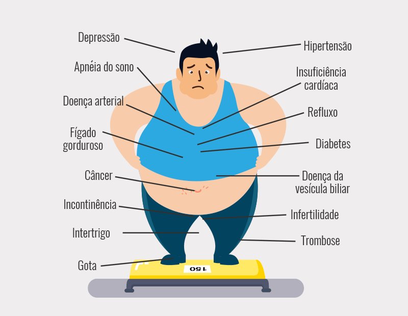 Segundo a OMS, o excesso de peso aumenta o risco no desenvolvimento de 13 tipos de câncer: esôfago estômago, mama, intestino, tireoide, pâncreas, e nos rins.