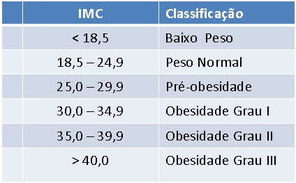 O IMC leva em consideração apenas seu peso e altura. Com a tabela abaixo você poderá ver melhor.