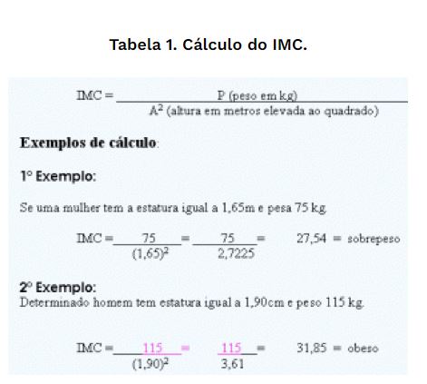 Na maioria das vezes, avalia-se a obesidade através do cálculo do Índice de Massa Corporal (IMC). Ele é feito da seguinte forma: divide-se o peso (em Kg) do paciente pela sua altura (em metros) elevada ao quadrado (Figura 1).